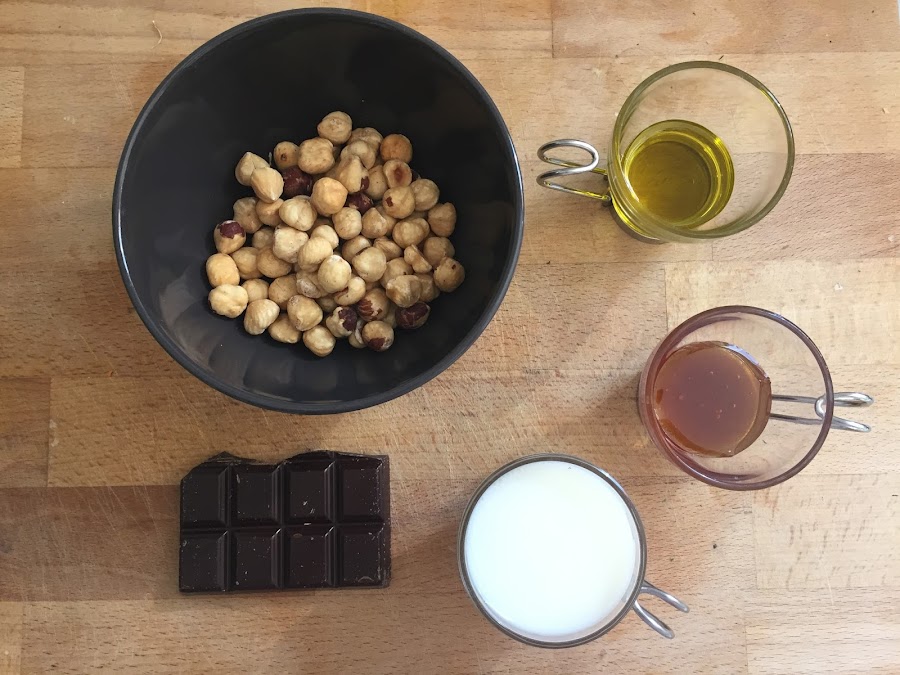 Después calentamos la miel para que podamos manejarla mejor y la vertemos encima del polvo de avellanas junto con el aceite y la leche.