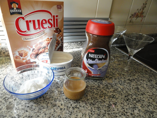 Una cucharada de cacao en polvoPonemos a calentar la nata (crema de leche) y disolvemos en ella el descafeinado, dejamos templar. En un bol colocamos el queso crema y agregamos poco a poco el café. y el azúcar glas y batimos bien, hasta obtener una mezcla cremosa. La cantidad de azúcar depende del gusto, yo la dejé más bien fuertecita de café. Ya sólo nos queda colocar un poquito de los cereales en cada copa, cubrir con la crema de café y espolvorear con un poco de cacao en polvo.