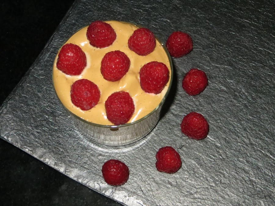 En un bol ponemos el café soluble, azúcar y luego añadimos el agua fría y comenzamos a montarla como si fuera nata (crema de leche). Ya veréis como en un par de minutos la crema de café sube y se os queda una textura como la de la nata montada (crema de leche). La colocáis en un vaso y decoráis la crema con frambuesas y ya está lista para servir.