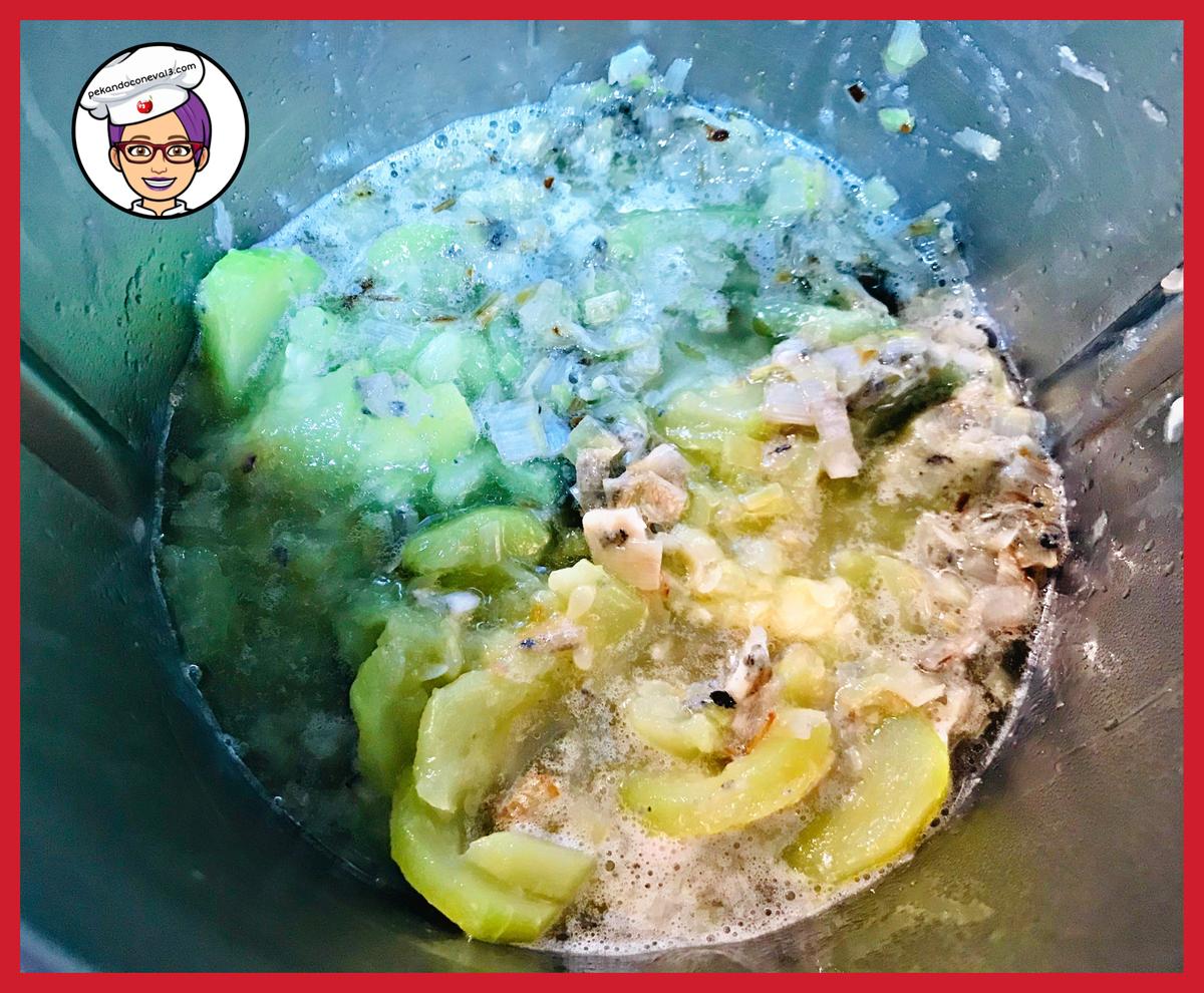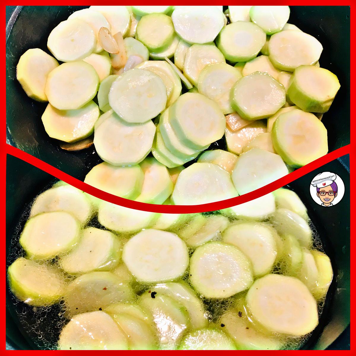 En una olla tapada ponemos unos 200 ml de agua y añadimos el calabacín y los ajos que cueza durante unos 15 minutos.