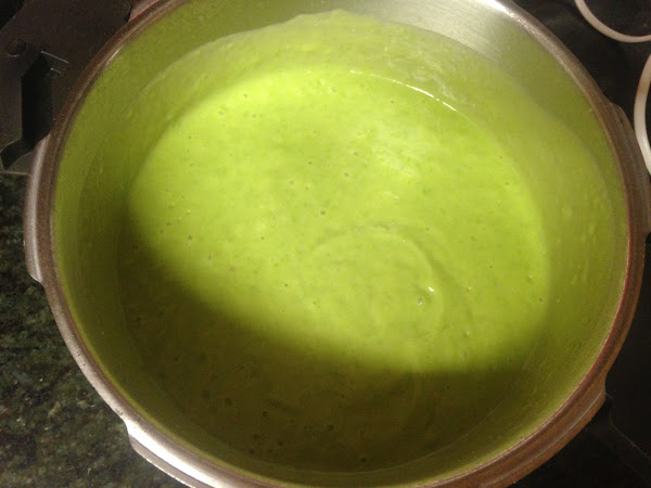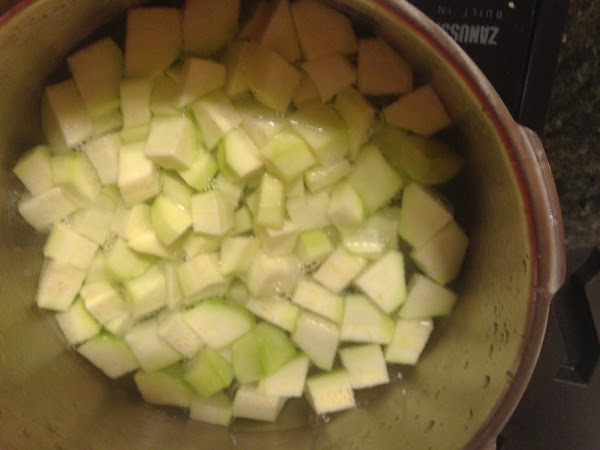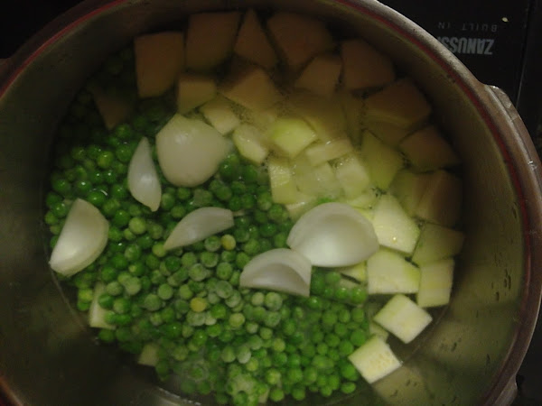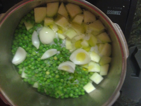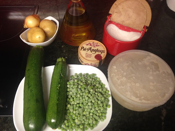 Pondremos en una cazuela el agua, el caldo y el chorrito de aceite.. Cuando empiece a hervir echaremos, el calabacín pelado y cortado, las patatas peladas y cortadas, la cebolla y por último los guisantes.