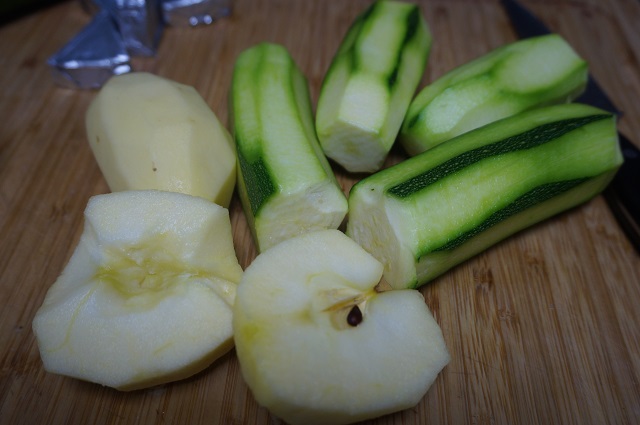 Para preparar esta crema de calabacín y manzana, empezaremos pelando los calabacines, la manzana y la patata.