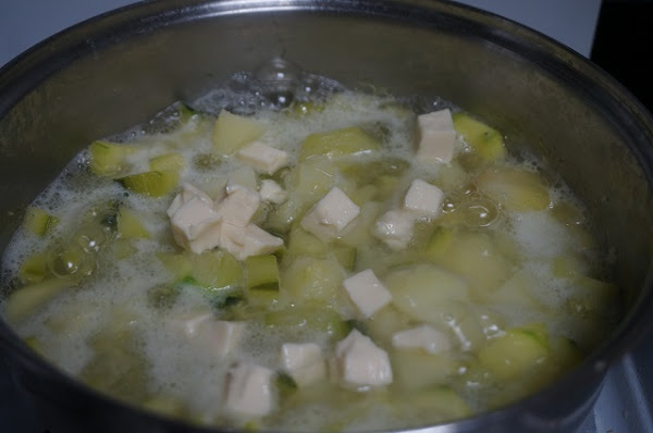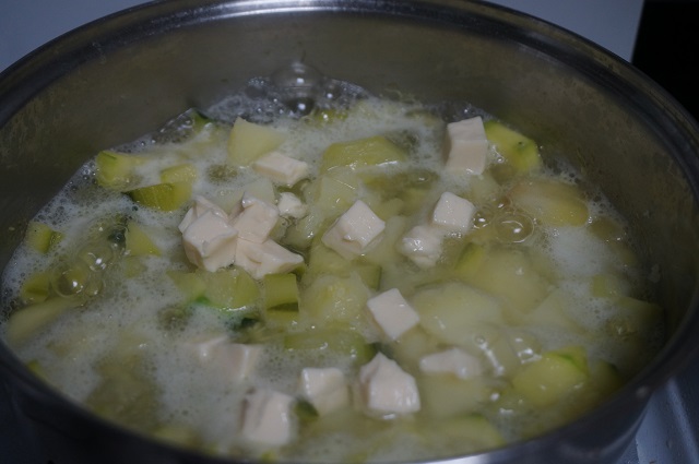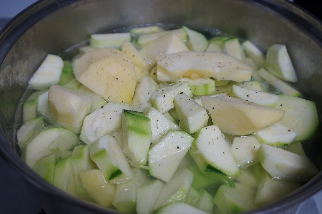 Ponemos una cazuela con agua a calentar, cortamos todos los ingredientes en trozos y los añadimos a la cazuela. Añadimos un poco de sal y pimienta. Lo dejamos cocinar unos 20 minutos.