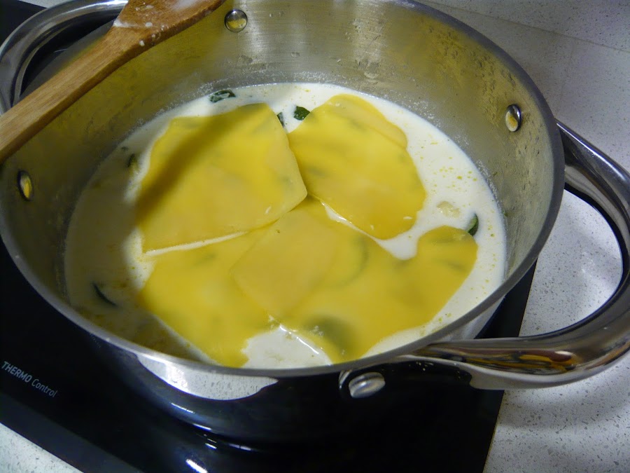 A la que veis que esta pochado todo añadís, el queso en lonchas y un bote de nata (crema de leche), yo para nosotros si que pongo nata (crema de leche), pero para los más peques la obvio, pero la verdad sea dicho que se nota ...