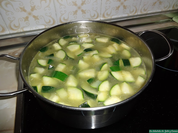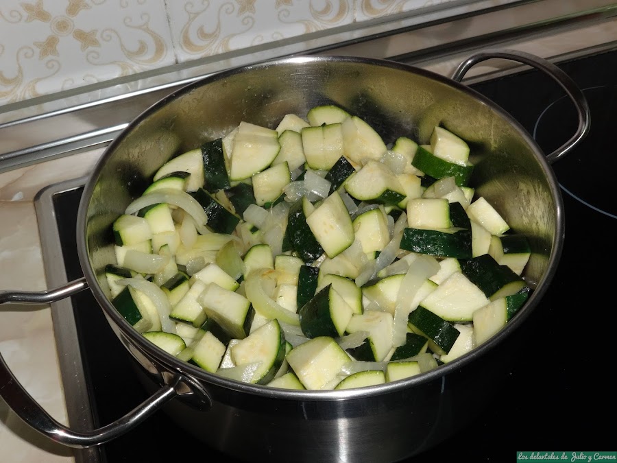 Pondremos en una cacerola con aceite a fuego medio-bajo, a pochar la cebolla. Cuando se vuelva transparente, vertemos el calabacín y mezclamos. Salamos ligeramente y dejamos cocinar, removiendo cada poco, unos 10 minutos.