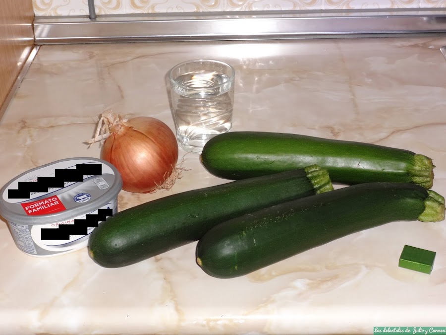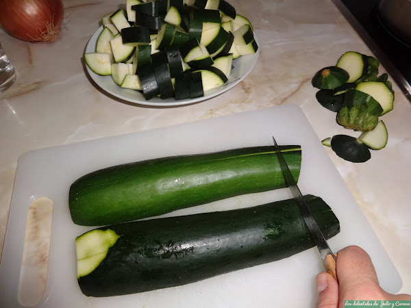 Lavamos y cortamos el calabacín en cuadraditos y la cebolla en tiras. Reservamos.