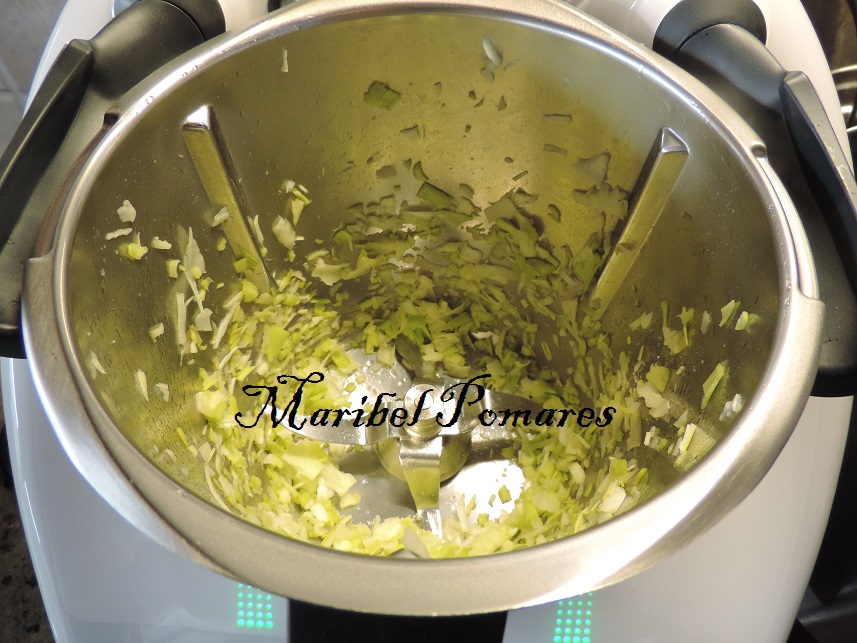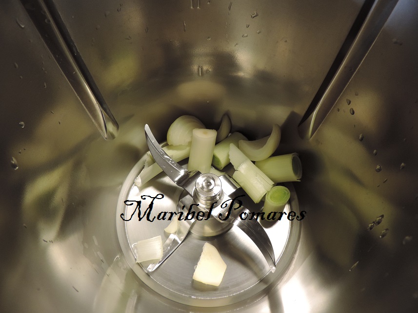 Poner el puerro y el diente de ajo en el vaso del thermomix.
