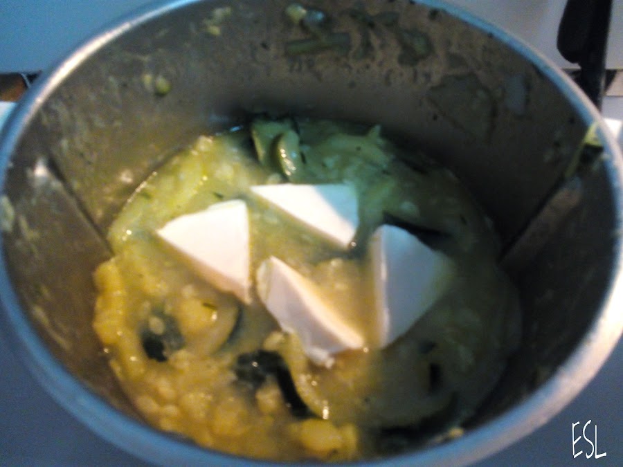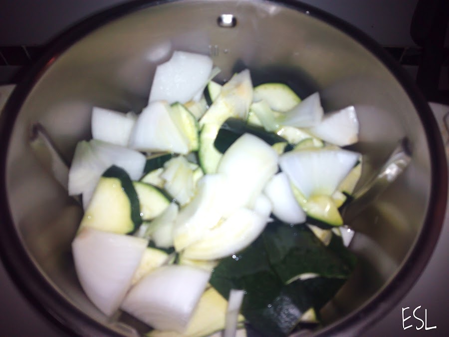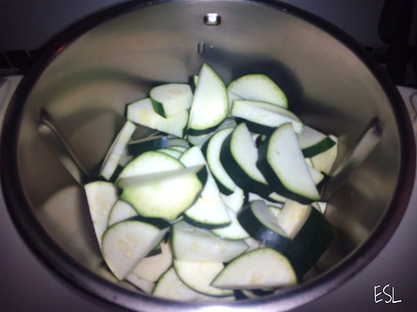 Lava, seca y trocea los calabacines (yo les dejo la piel) en trozos grandes. Viértelos en el vaso e incorpora la cebolleta pelada y cortada en cuartos y el aceite. Sofríe 12 minutos, temperatura varoma y velocidad 2, sin cubilete.