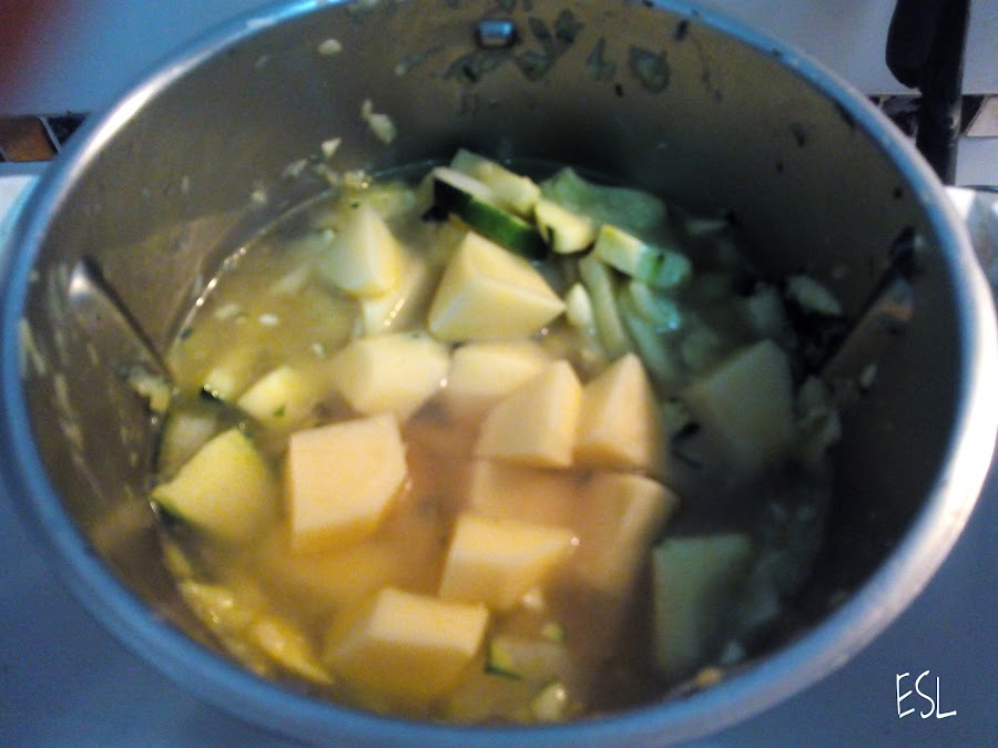 A continuación, añade la patata (pelada y cortada en trozos), el caldo de pollo y cuece 20 minutos, temperatura varoma, velocidad cuchara, con el cubilete puesto.