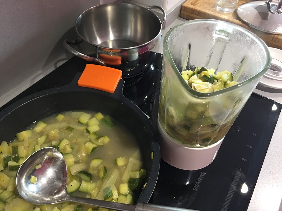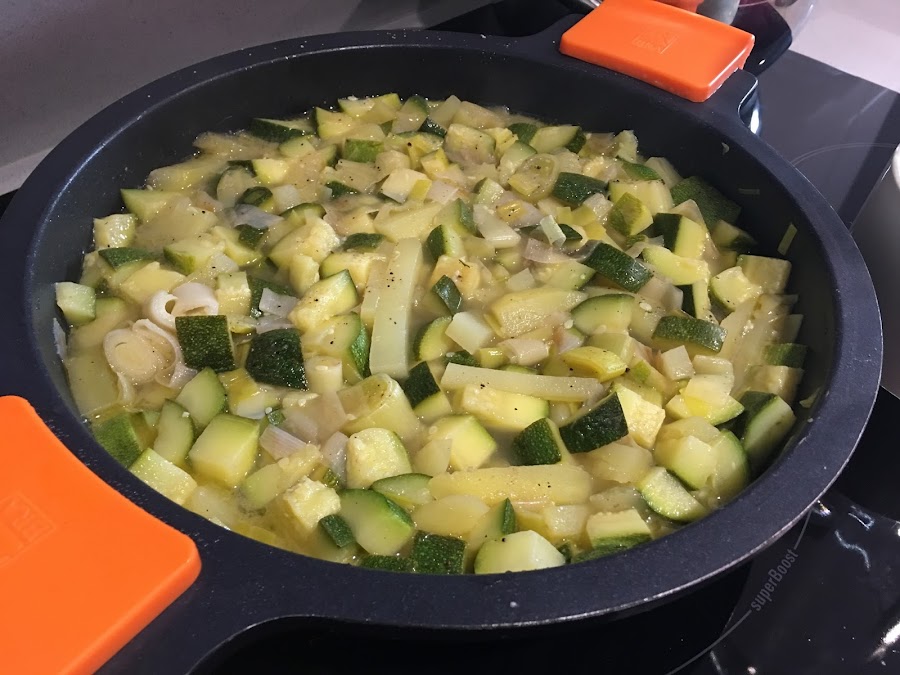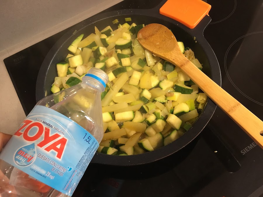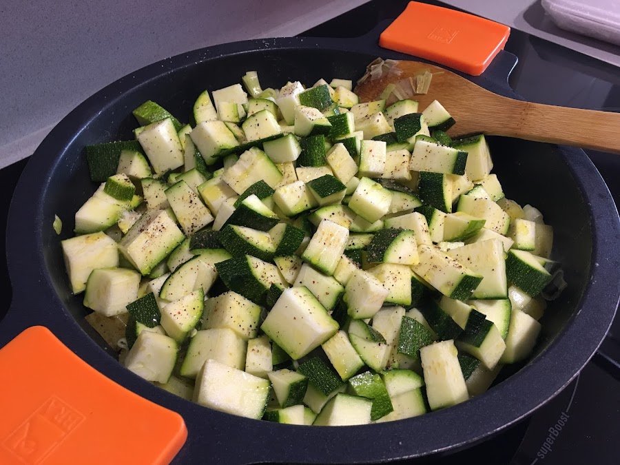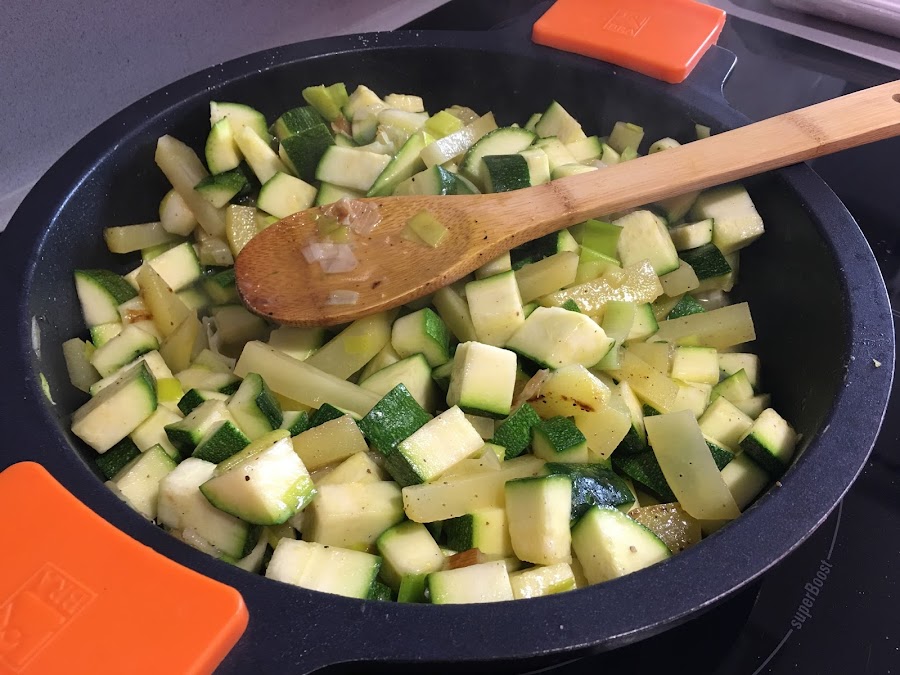 3. Añadimos el calabacín cortado en cuadraditos si pelar y rehogamos 5 o 6 minutos más.