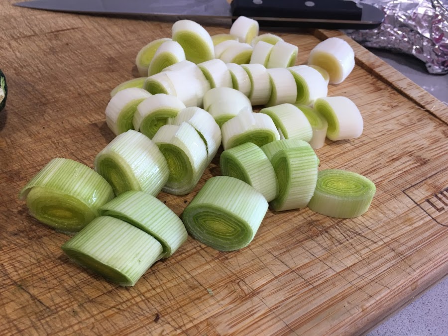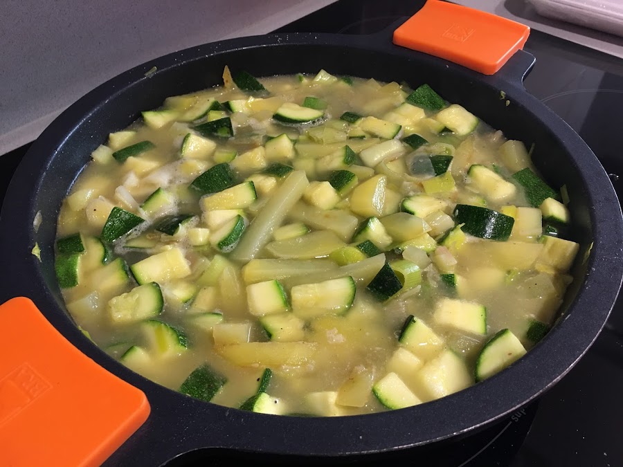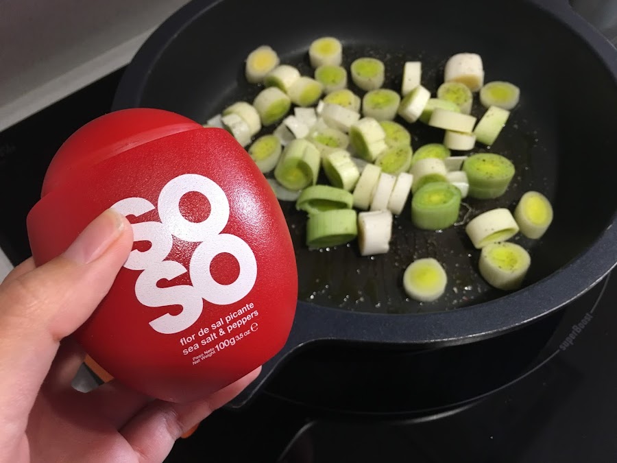 1. Lavamos y cortamos en rodajas los puerros, en bastoncitos las patatas y en cuadraditos los calabacines. Ponemos un chorrito de aceite de oliva virgen extra en la cazuela y calentamos a fuego medio. Añadimos el puerro, salpimentamos con la flor de sal Soso Factory y sofreímos a fuego medio durante 10 minutos.