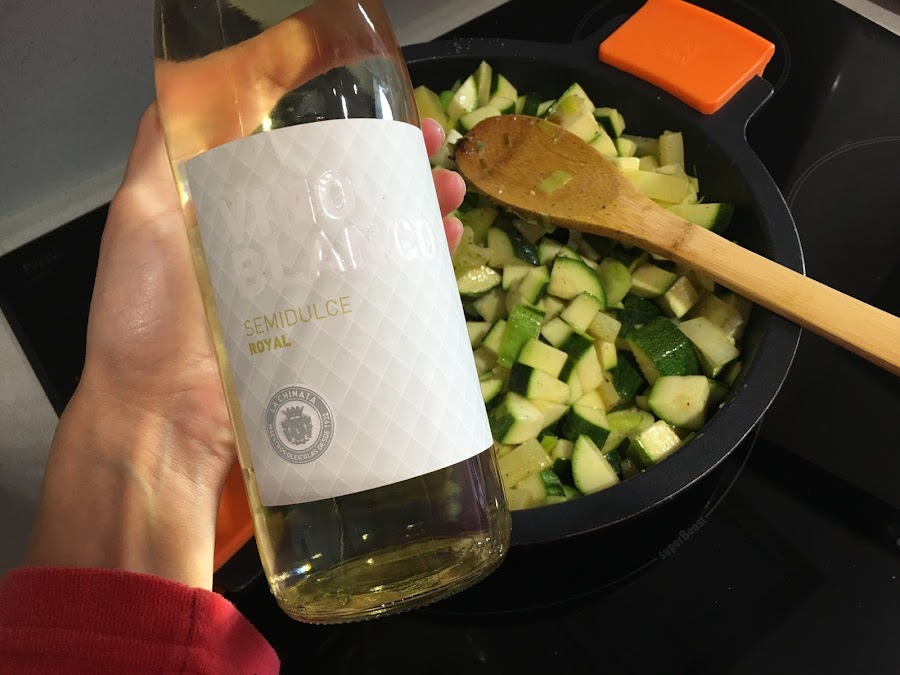 4. Añadimos el vino blanco la Chinata, subimos el fuego y dejamos que evapore el alcohol. A continuación añadimos el agua, la justa hasta que cubra el puerro y las patatas. Salpimentamos y dejamos hervir a fuego medio durante 20 minutos.