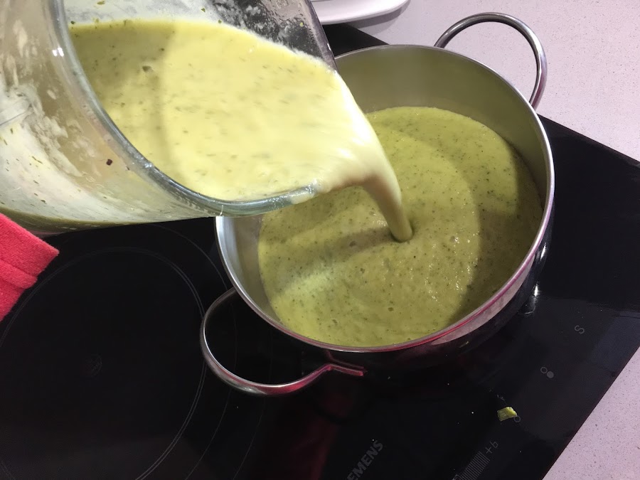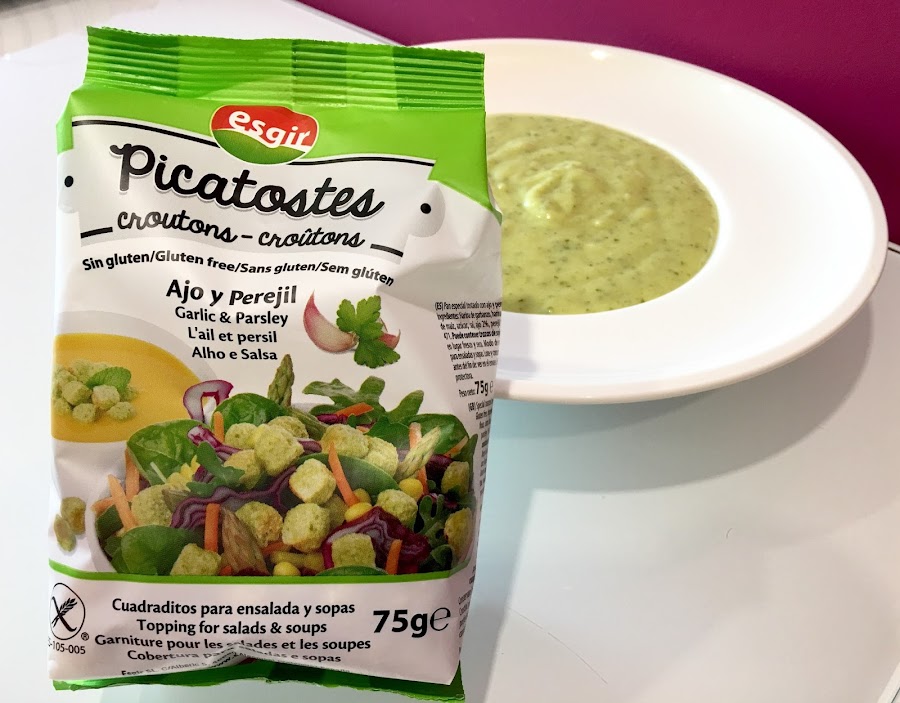 6. Vertemos el puré en la olla antes de servir. Emplatamos y ponemos por encima unos picatostes de ajo y perejil de Esgir. Estos picatostes son sin gluten hechos a base de harina de arroz, maís y garbanzo, totalemente naturales.