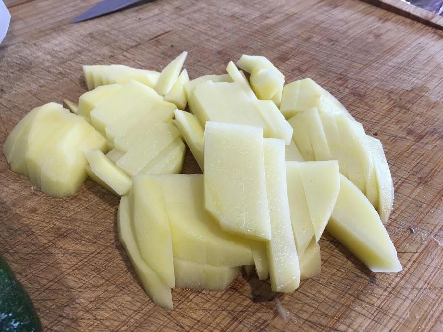 2. Añadimos la patata en bastoncitos finos para que se cueza con facilidad posteriormente. Rehogamos durante 5 minutos mas.