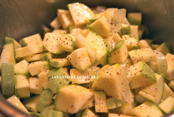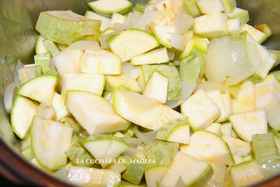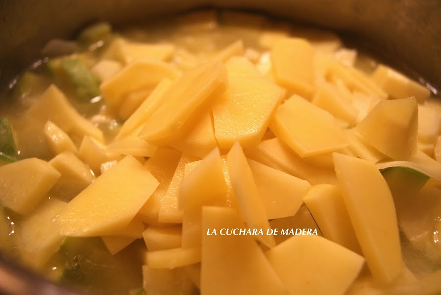 Cortamos las papas en trozos finos para que se hagan rápido, ya que el calabacino apenas tarda en hacerse;cubrimos con agua y lo dejamos al fuego medio hasta que las papas estén cocidas.