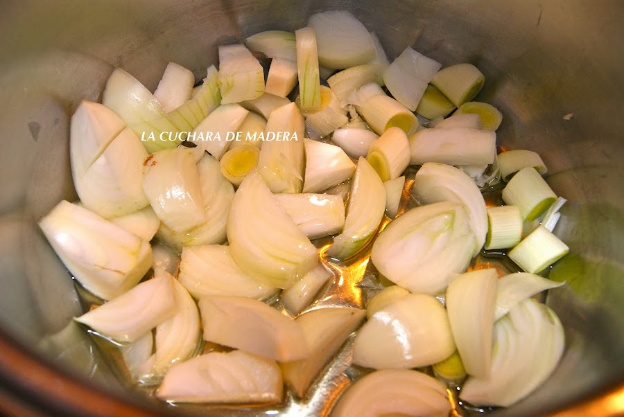 Pelamos la cebolla y el puerro, los cortamos en trozos y lo ponemos en un caldero con un poco de aceite de oliva a fuego medio unos minutos hasta que estén transparentes.Del puerro sólo usamos la parte blanca.