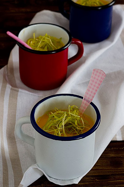 Cortamos el puerro en juliana muy fina y lo blanqueamos unos segundos en agua hirviendo, lo introducimos en agua fria y colocamos en papel de cocina. Freímos en aceite de oliva. Presentamos la crema con el puerro por encima.