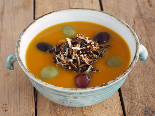 El arroz salvaje, a pesar de su nombre, es una planta herbácea acuática lejanamente emparentada con el arroz, rico en fibra y proteína. Aquí lo añadimos frito a la crema de calabaza asada, el sabor y su textura crujiente van de maravilla y contrasta con la frescura y el dulzor de las uvas y el toque especiado del curry.