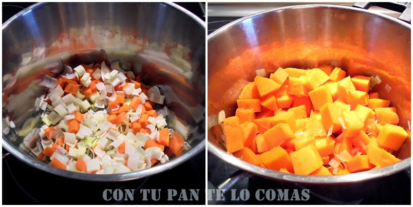 2. Cortar la calabaza en dados e incorporarlos a la cazuela. Rehogar unos diez minutos más removiendo casi continuamente para que no se pegue al fondo. Sazonar con sal.
