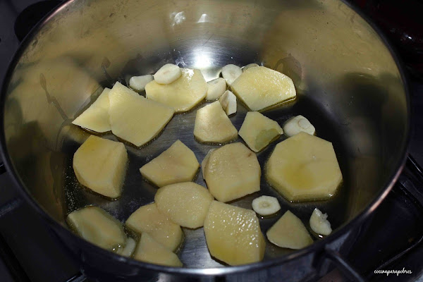 Ponemos los dientes de ajo pelado pelados y cortados en trozos gruesos junto a la patata pelada y troceada en una olla con un poco de aceite de oliva, mezclamos y dejamos hasta que el ajo tome color.