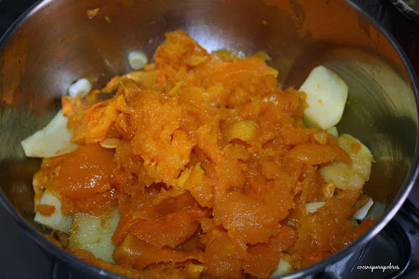 Incorporamos entonces las carne de la calabaza, dejamos un par de minutos al fuego y cubrimos con agua.