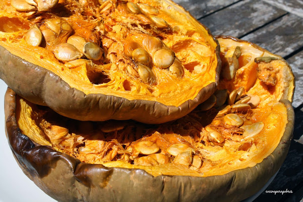 Hace unas semanas me vine de casa de mis padres con una calabaza, desde el principio tenía claro que quería asarla al horno y comerla en crema así que esa misma noche, que tenía el horno caliente después de preparar pizza casera asé la calabaza y reservé para hacer la crema a la mañana siguiente.