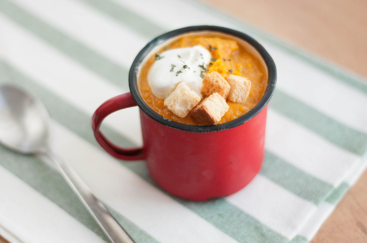 4.- Servimos la crema de calabaza acompañada de una hojitas de tomillos,unos picatostes y 1 o 2 cucharadas de nata (crema de leche) agria.