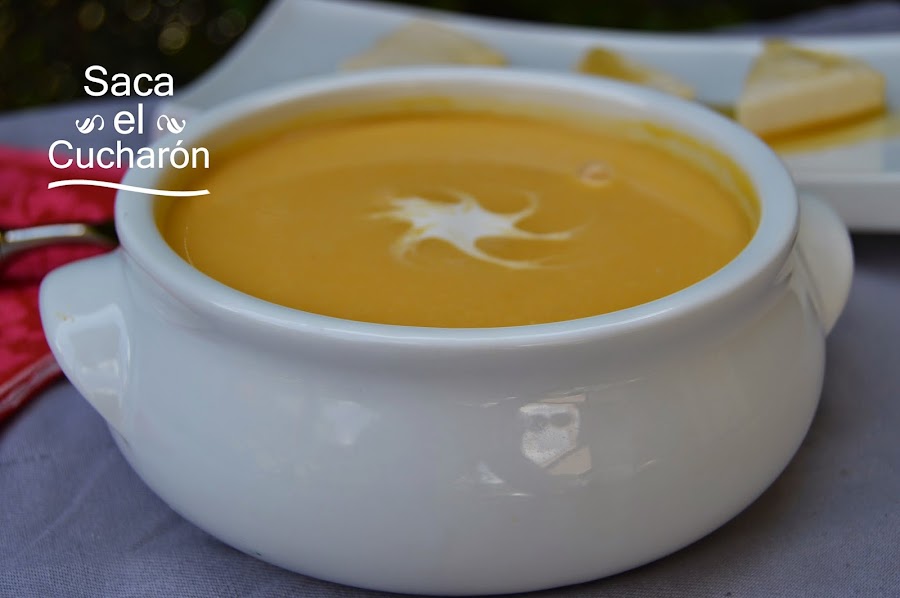 Transcurrido este tiempo sacamos con cuidado y con la ayuda de una cuchara vamos separando la carne de la calabaza de la corteza. Ponemos la carne de la calabaza junto con la cebolla pelada y la mitad del caldo en un recipiente y batimos hasta conseguir una crema fina.