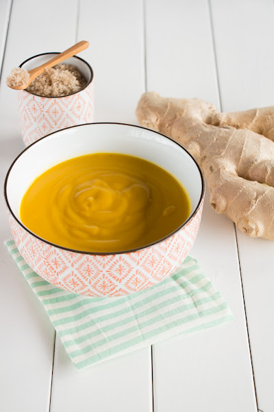 Uno de esos días, de vuelta de la frutería, con la compra esparcida sobre el mármol de la cocina, nació esta crema naranja. Tenía unos dados de calabaza, unos cuantos boniatos que pensaba hacer asados y un manojo de zanahorias. Y me entró una necesidad muy fuerte de mezclarlo todo. Como también había comprado una raíz de jengibre tan grande como Andorra, me pareció buena idea añadir un pedacito.
