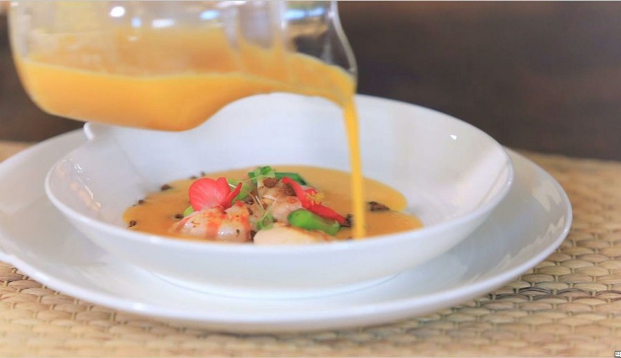 Para pochar las verduras añadiremos la mantequilla, la sal y la pimienta y escogeremos el programa Slow Cook (P1), a 130 ºC, 15 minutos. Una vez rehogadas, incorporaremos la infusión de nata con citronella que teníamos reservada y el caldo de verduras. Ahora hay que cocinarlo todo. Para ello escogeremos Slow Cook (P2) y seleccionaremos 95 ºC y 25 minutos.
