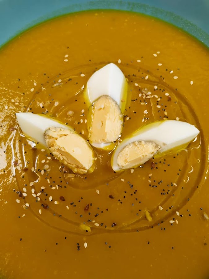 Servimos en platos, decoramos con un chorro de aceite de oliva, unas semillas y el huevo cocido en cuartos.