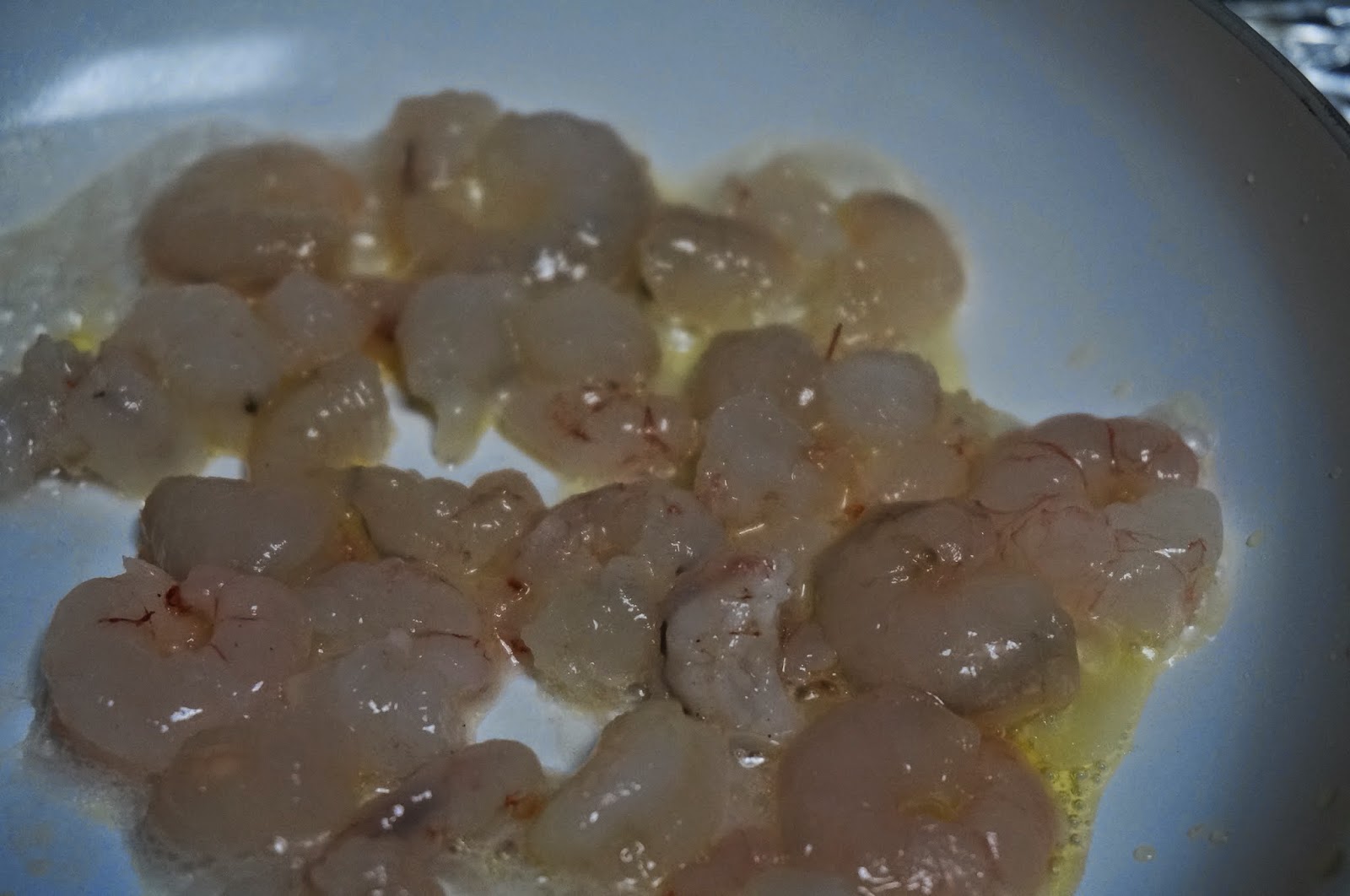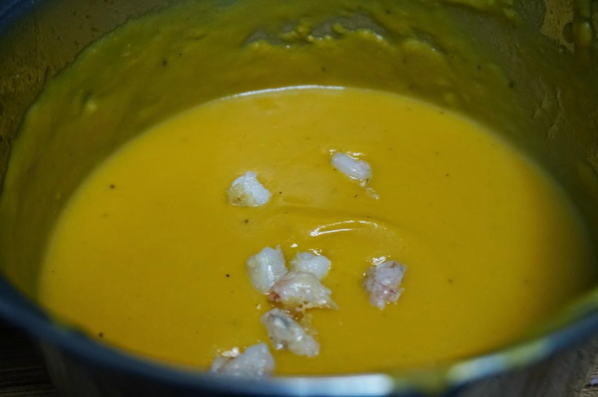 Por otro lado en una sartén freiremos unas gambitas a trocitos y dejamos alguna entera para adornar y las echamos a la crema.