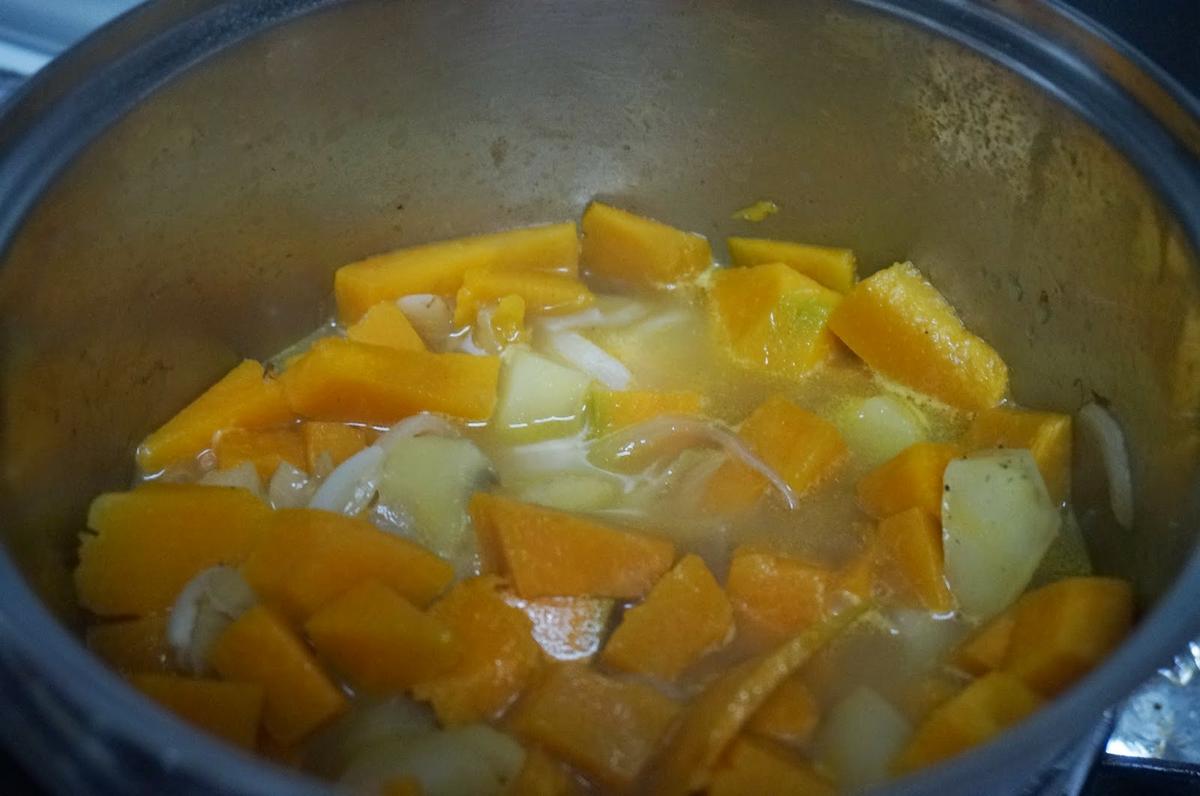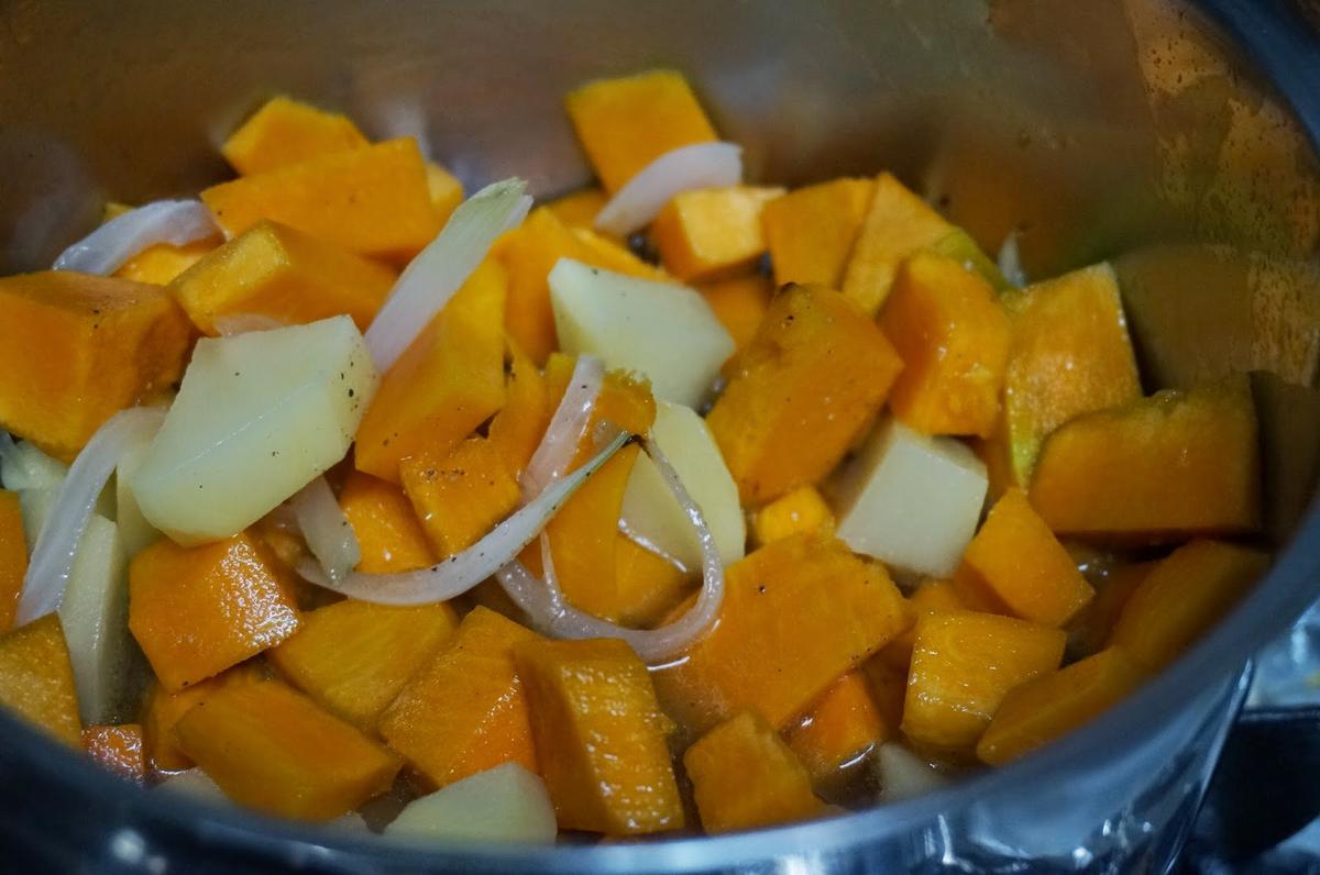 Pelaremos y trocearemos la calabaza y las patatas y lo echaremos junto a la cebolleta.