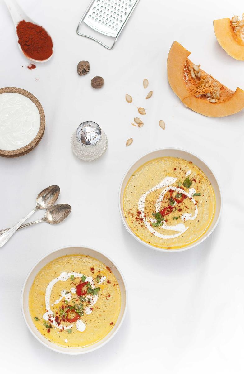 La crema de calabaza con leche de coco es una crema dulzona, con mucho sabor y bastante sencilla de hacer, con un toque exótico añadido con el de curry y coco, que podrás dejar preparada con antelación el día anterior, si dispones de más tiempo, y cuando vayas a tomarla, añadirle los toppings por encima en ese mismo momento.