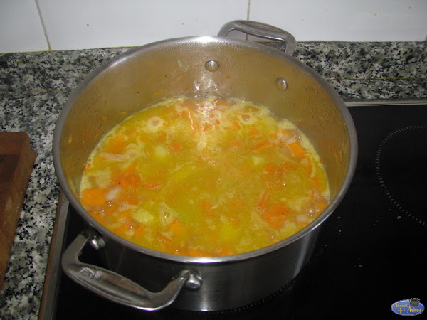Salpimentamos un poco y ya le podemos empezar a añadir unas gotas de Tabasco.Cubrimos con el caldo y dejamos cocer tapado a fuego lento unos 45 minutos.
