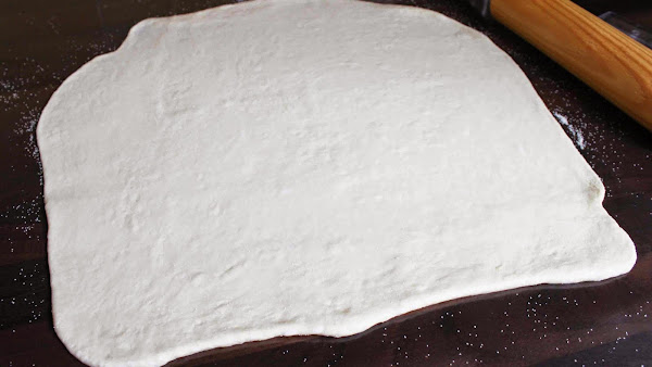 5. Ponemos la masa encima de una superficie generosamente espolvoreada con sémola de trigo de tamaño mediano, desgasificamos la masa y la extendemos con el rodillo: