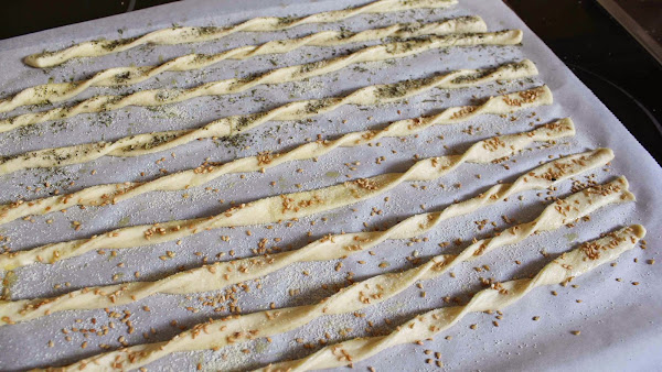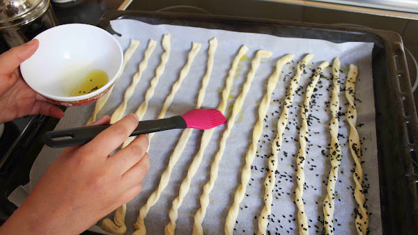7. Hacemos rodar las tiras suavemente encima de la superficie de trabajo y vamos alargando hasta llegar a la longitud de la bandeja donde hornearemos los grissini. Los ponemos en la bandeja tapizada con papel de horno, los pincelamos con un poco de aceite y los espolvoreamos con sésamo negro, orégano seco, pimentón picante....