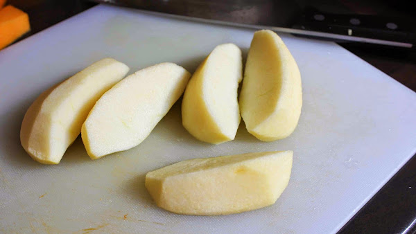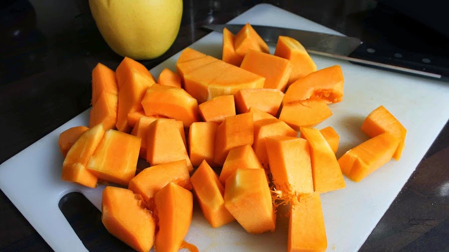 2. Ahora lavamos la calabaza, la pelamos y la cortamos en trozos medianos. Pelamos la manzana, la descorazonamos y la cortamos en cuartos. Agregamos al vaso de la thermomix y trituramos durante 7 seg/ vel 5 y luego programamos por 10 min/100ºC/ vel 2.