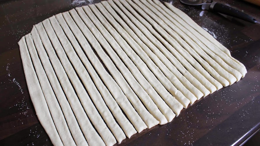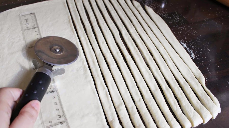 6. Cortamos tiras largas de 0,8-1 cm con la ayuda de un cortapizza o con un cuchillo bien afilado: