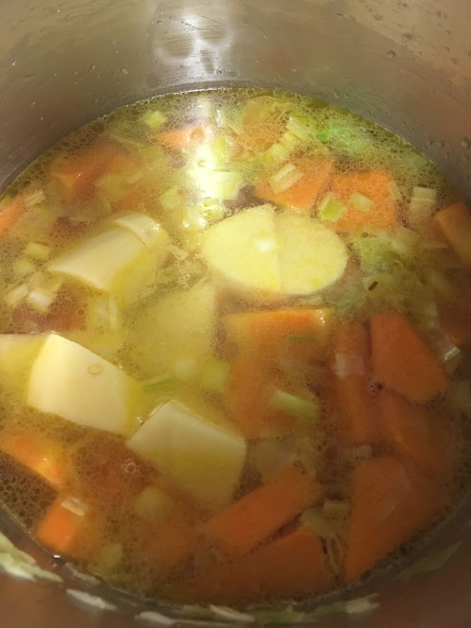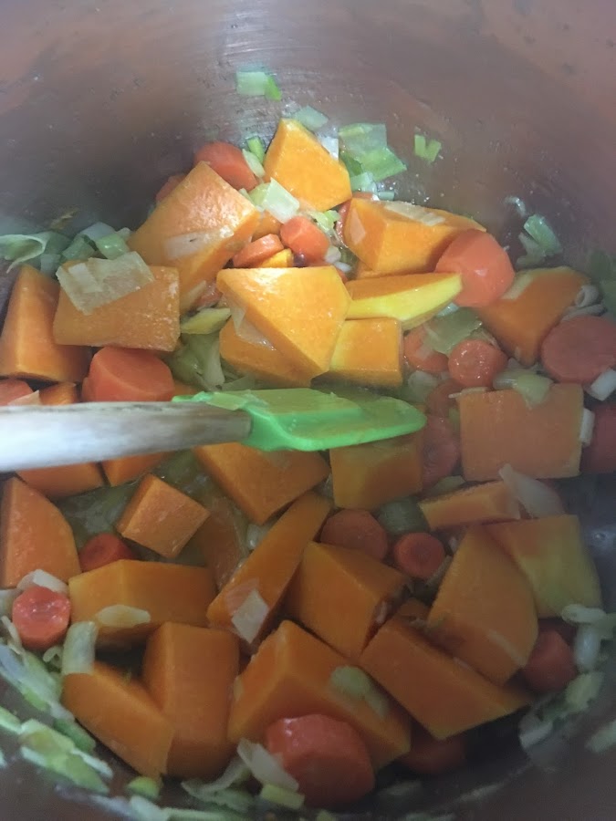 Se añaden las zanahorias, raspadas, lavadas y cortadas en trozos; la calabaza troceada y sin la piel dura y la patata pelada y lavada. Se rehoga todo unos instantes.