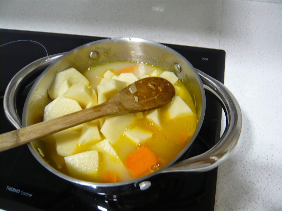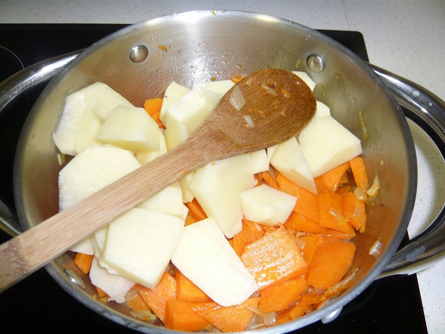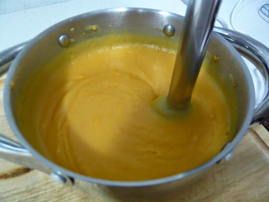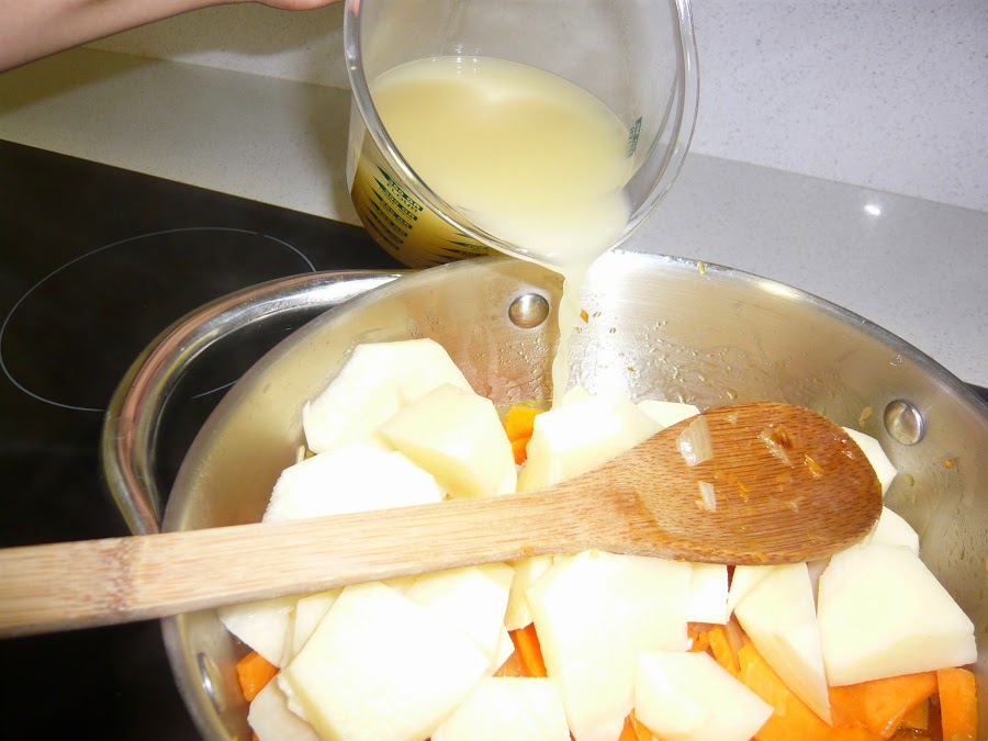 A la que se poche, incorporar la calabaza y las papapas cortadas en crish, crish (como dice mi bebé) para que así coja más cuerpo la crema.