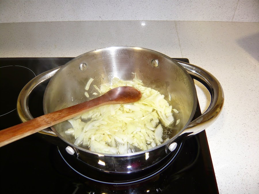 En una olla alta cortar la cebolla a brunoise, con un chorretín de aceite y una pizca de sal.