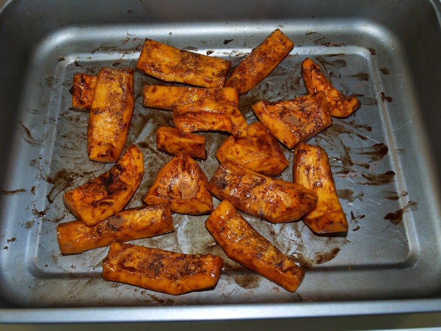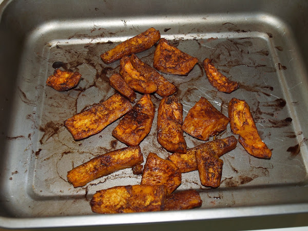 - Pelamos y cortamos la calabaza en trozos. La ponemos en una fuente de horno y la mezclamos bien con el aceite y la canela (y la sal). La metemos en el horno ya caliente a 200º C y la asamos unos 70 minutos (yo hice la mitad de cantidad y necesité más o menos la mitad de tiempo) hasta que esté blandita (pinchamos con un tenedor). En el libro pone que tapemos la bandeja con papel de aluminio. Yo me olvidé pero no pasó nada, así que como veáis.
