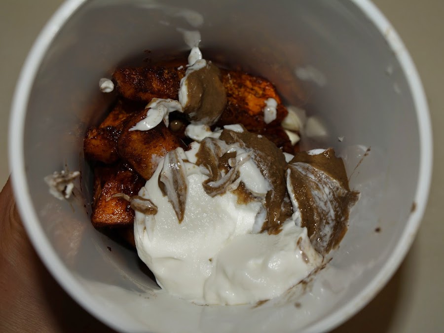 - Cuando la calabaza esté algo más fría, la ponemos en un vaso largo junto con el yogur, el tahini y el ajo, y batimos hasta obtener una pasta espesa. Esa es la consistencia que buscamos.
