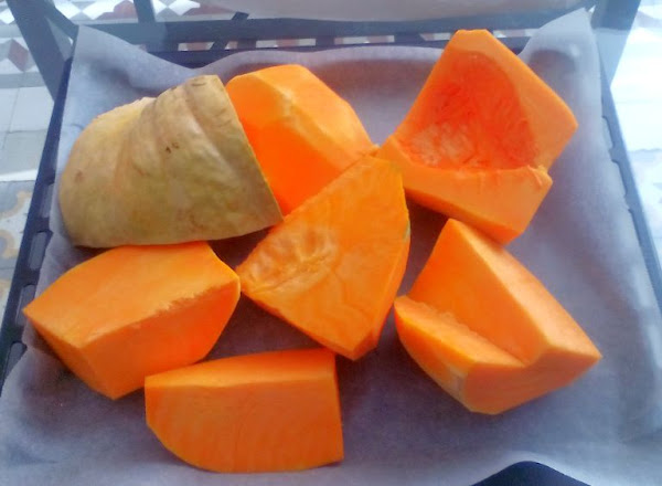 En primer lugar, cortamos la cantidad de calabaza que vayamos a usar y la limpiamos, retiramos piel y pepitas. En una fuente para horno la colocamos y añadimos un poco de sal, la tendremos en el horno hasta que quede blanda.