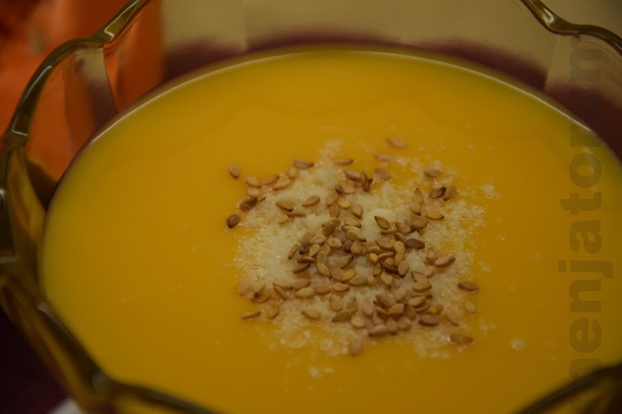 Podéis acompañar con unas sopitas de pan tostado y espolvorear con queso rallado y sésamo.