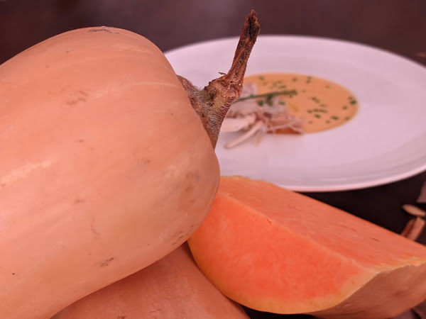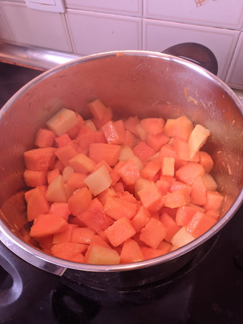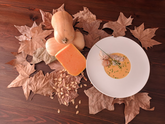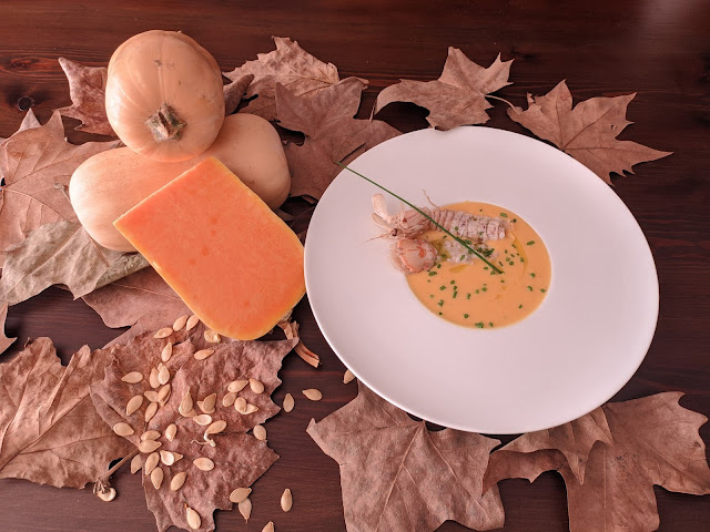 Pelar y cortar en mirepoix la calabaza y volcar en una cazuela con aceite de oliva virgen extra.