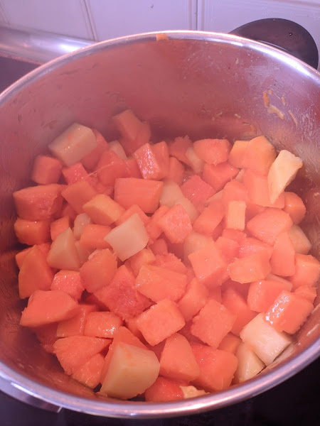 Pelar y cortar las patatas y las zanahorias y añadir a la cazuela.
