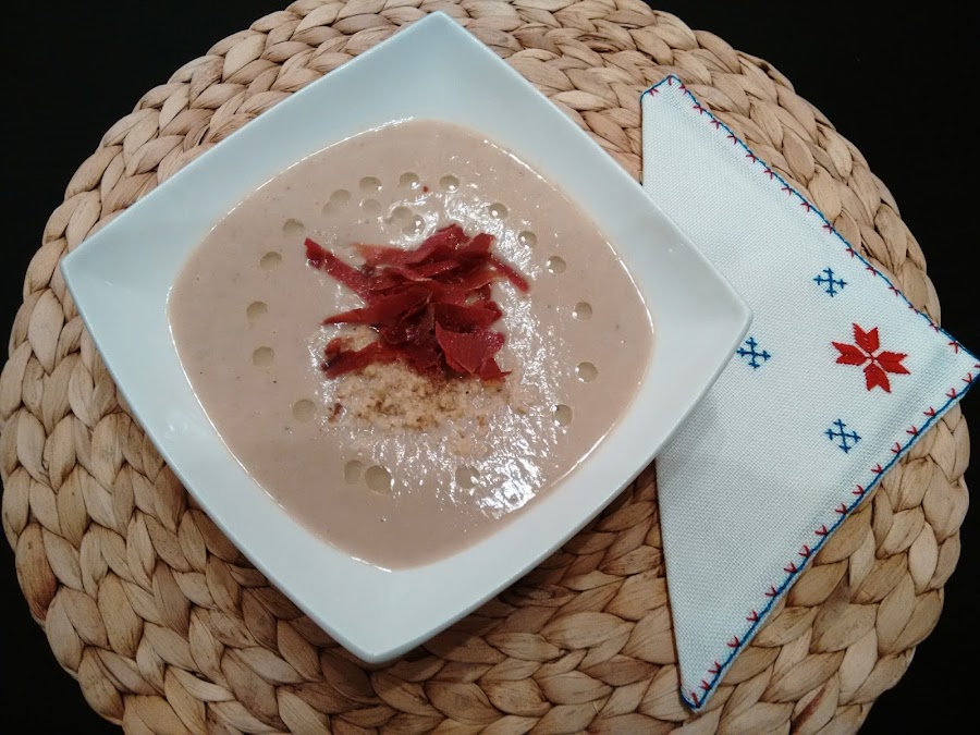 Sólo faltaría emplatar. Ponemos la crema y luego el jamón con las nueces y unas gotitas de aceite de trufa. Espero que os guste tanto como a mí!