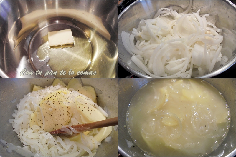2. Pasado ese tiempo, añadir la patata en rodajas finitas, sazonar con sal y pimienta y cubrir con agua o caldo (yo le puse de pollo), aproximadamente litro y medio.